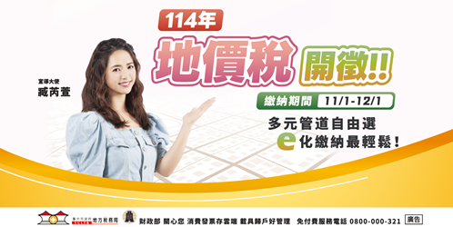 「114年地價稅開徵!記得在12月1日前完成繳稅,手機電子支付繳最方便,更多資訊請上地稅局官網地價稅開徵專區查詢或撥打客服專線22585000按1。」。