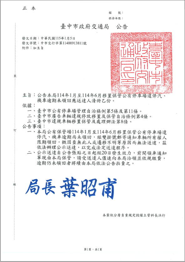 【轉知】臺中市政府交通局114年1月至114年6月移置保管公有停車場違規停車逾期未領回車輛通知單公示送達公告及清冊
