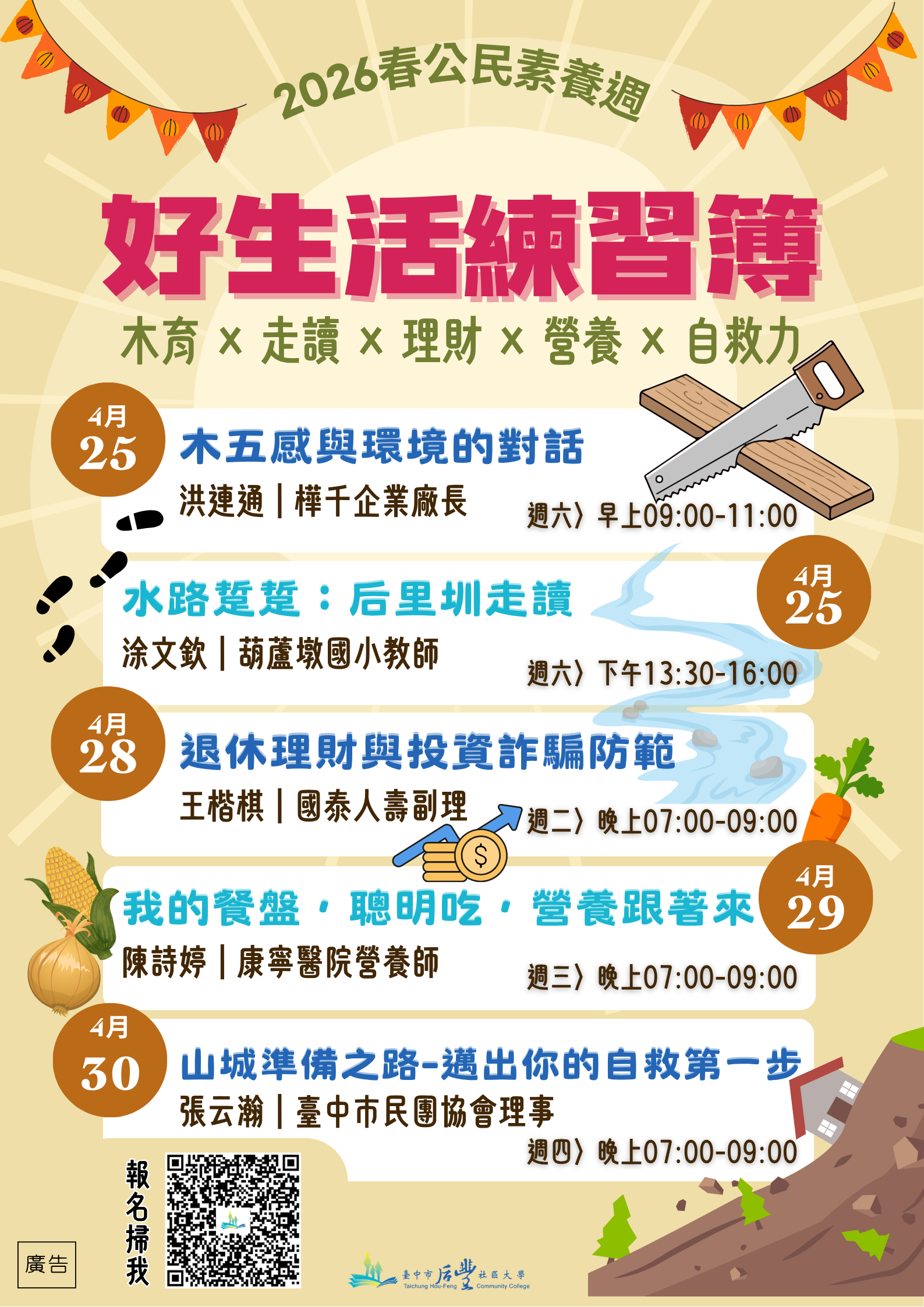 - 場次皆免費參與,內容請參閱後續豐社區大學公民素養週報名頁(https://forms.gle/A39mL5omQUEWjNM1A)或電洽承辦人吳宗憲電話:04-25230460#16